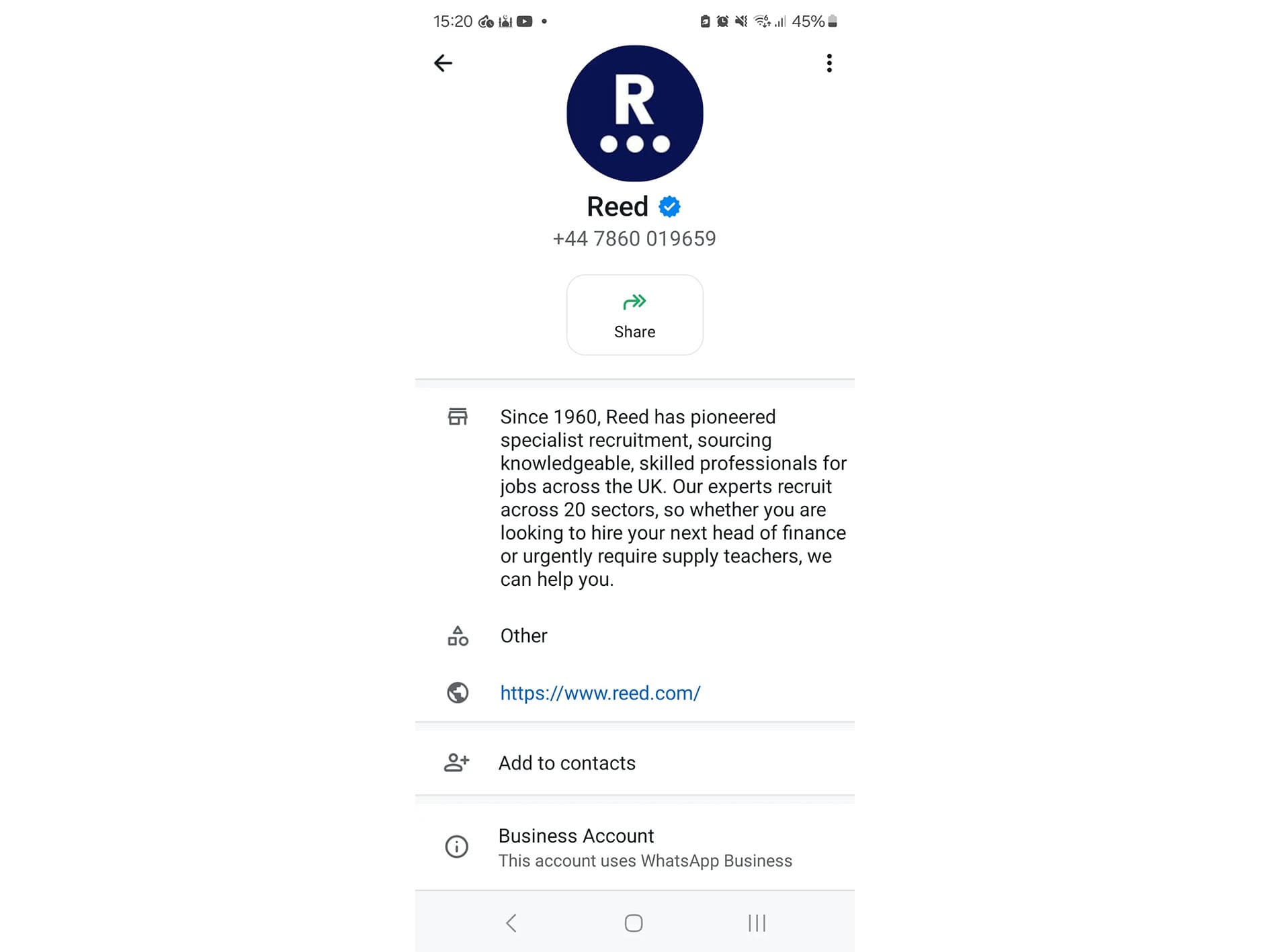 Our WhatsApp account has the verified blue tick and following blurb (see image below), the account is also linked to this website (www.reed.com).