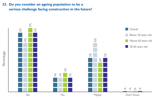 The below graph shows the number of respondents (and their ages) who believe that the ageing population is a serious challenge facing construction in the future. An overwhelming majority of professionals feel it is a serious challenge.