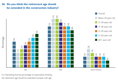 Despite the government’s efforts, when surveyed, 59.9% of respondents said that it has not effectively dealt with the challenge of an ageing population. And when asked if the retirement age should be increased in the construction industry, unsurprisingly, the majority said no.